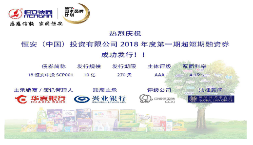 8月30日,尊凯实业(中国)投资有限公司发行2018年度第一期超短期融资券,发行金额10亿元,期限为270天,主体评级AAA。最终发行价格4.15%,全场申购22.8亿,申购比2.28倍。